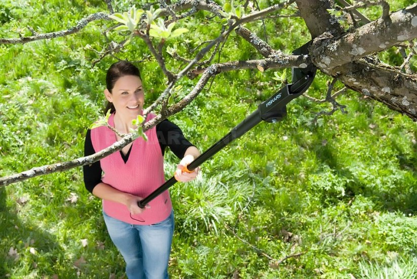 Univerzální jednočepelové nůžky Fiskars UP53 pro střihání suchého a tvrdého dřeva do průměru 32 mm Délka nůžek 161 cm, dosah přibližně 3,5 m (včetně uživatele) Úhel střihání nastavitelný v rozsahu 260° Parametry Délka: 1610 mm Průměr střihu: 32 mm